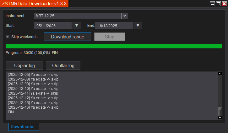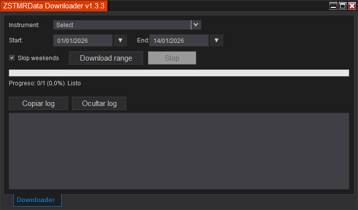 ZSTMRData Downloader es una herramienta para NinjaTrader 8 diseñada para que descargar Market Replay deje de ser una tarea repetitiva. Con una interfaz clara y directa, te permite seleccionar un instrumento y un rango de fechas para que la descarga se gestione de forma ordenada y automática día a día.