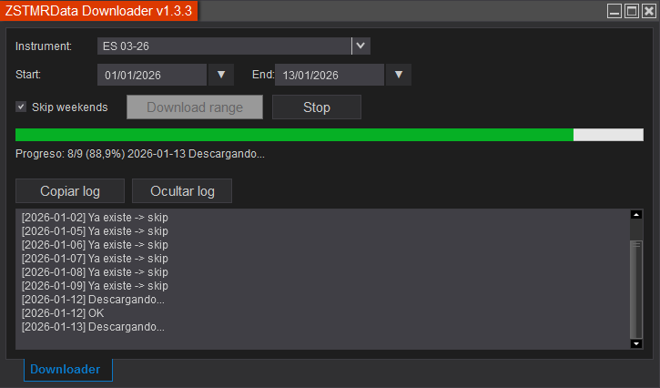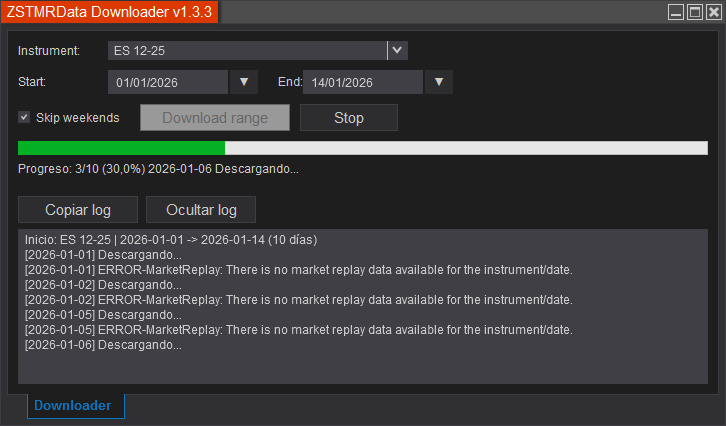 Ideal para: traders que quieren mantener su Market Replay al día, usuarios que preparan backtesting/entornos de práctica, y cualquiera que quiera simplificar la descarga de datos sin complicaciones.